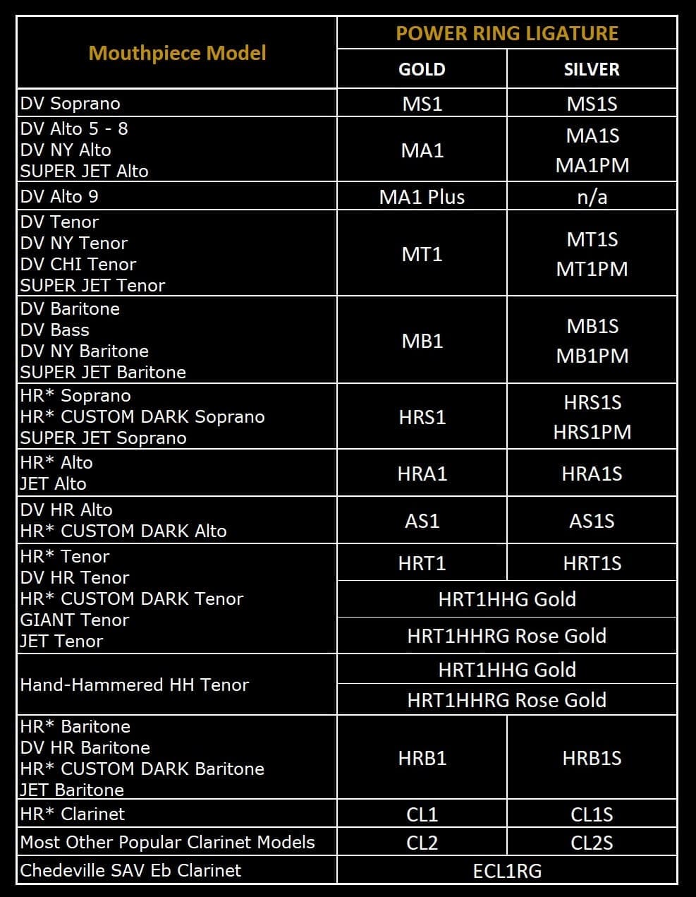 Use this Guide to find the POWER RING Ligature that fits your JodyJazz mouthpiece. PLEASE NOTE: Because of the distinctive size and shape of the POWER RING Ligature you will require a larger cap for your setup! That is why all POWER RING Ligatures now also include a cap. To use this guide, locate your mouthpiece in the chart then see which POWER RING Ligature model you will need.
