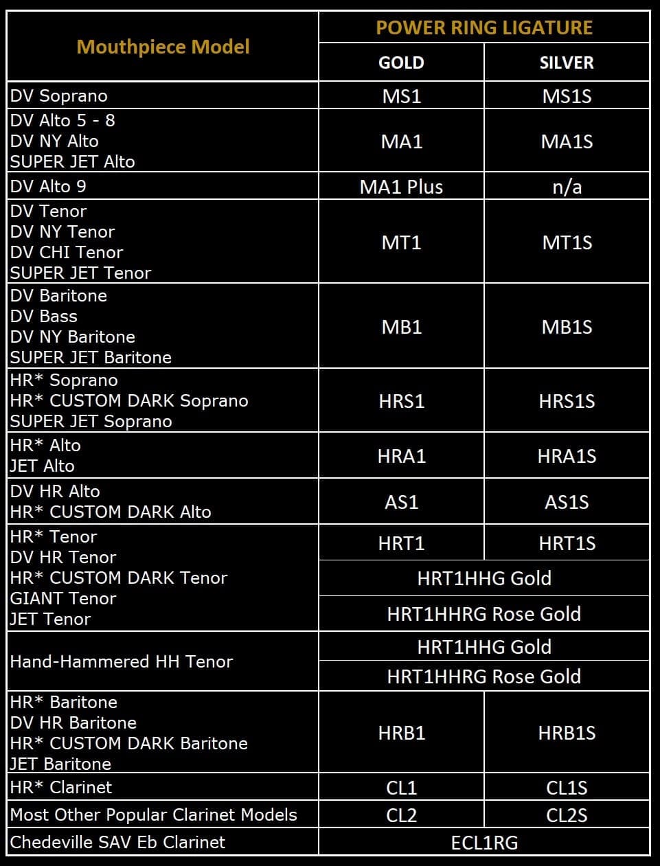 Use this Guide to find the POWER RING Ligature that fits your JodyJazz mouthpiece. PLEASE NOTE: Because of the distinctive size and shape of the POWER RING Ligature you will require a larger cap for your setup! That is why all POWER RING Ligatures now also include a cap. To use this guide, locate your mouthpiece in the chart then see which POWER RING Ligature model you will need.